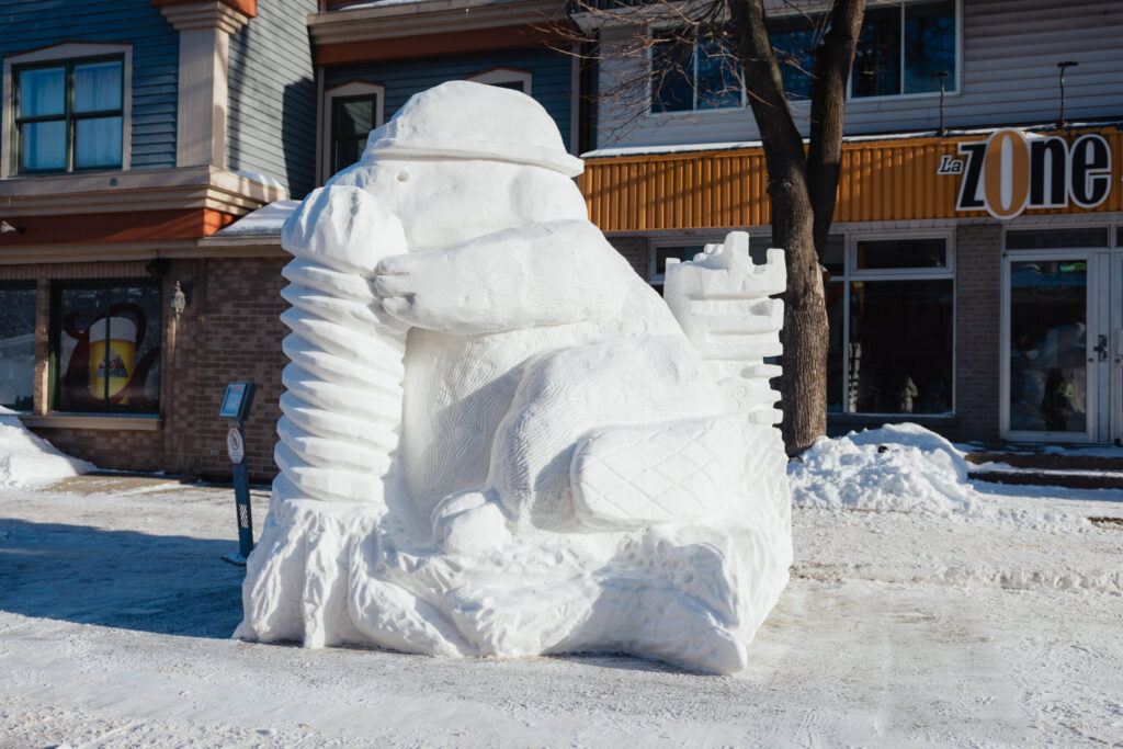 Première position : « Identité sucrée » du Cégep Saint-Laurent. Crédit photo : Courtoisie La rue Lafontaine à Rivière-du-Loup a vibré au rythme de la créativité étudiante du 30 janvier au 1er février, alors que se tenait la 30e édition du Concours intercollégial de sculpture sur neige, présenté sous le thème « Nos identités ». Malgré une température moyenne de -15 °C, l’événement a attiré plus de 3 500 visiteurs au cours de la fin de semaine.